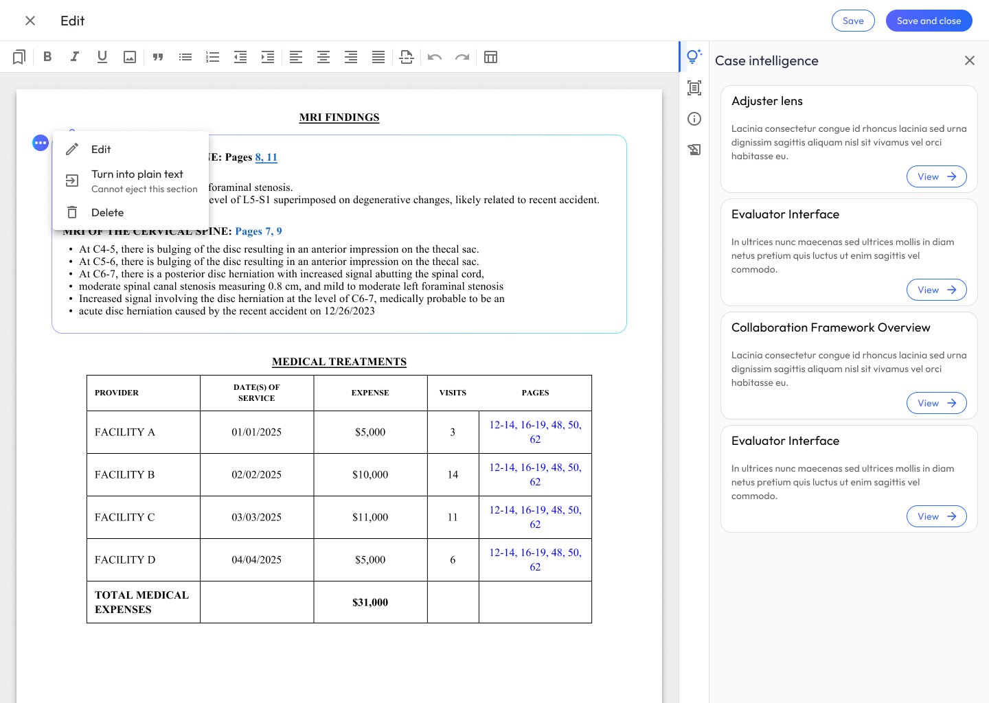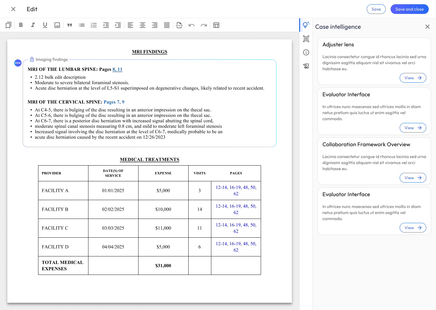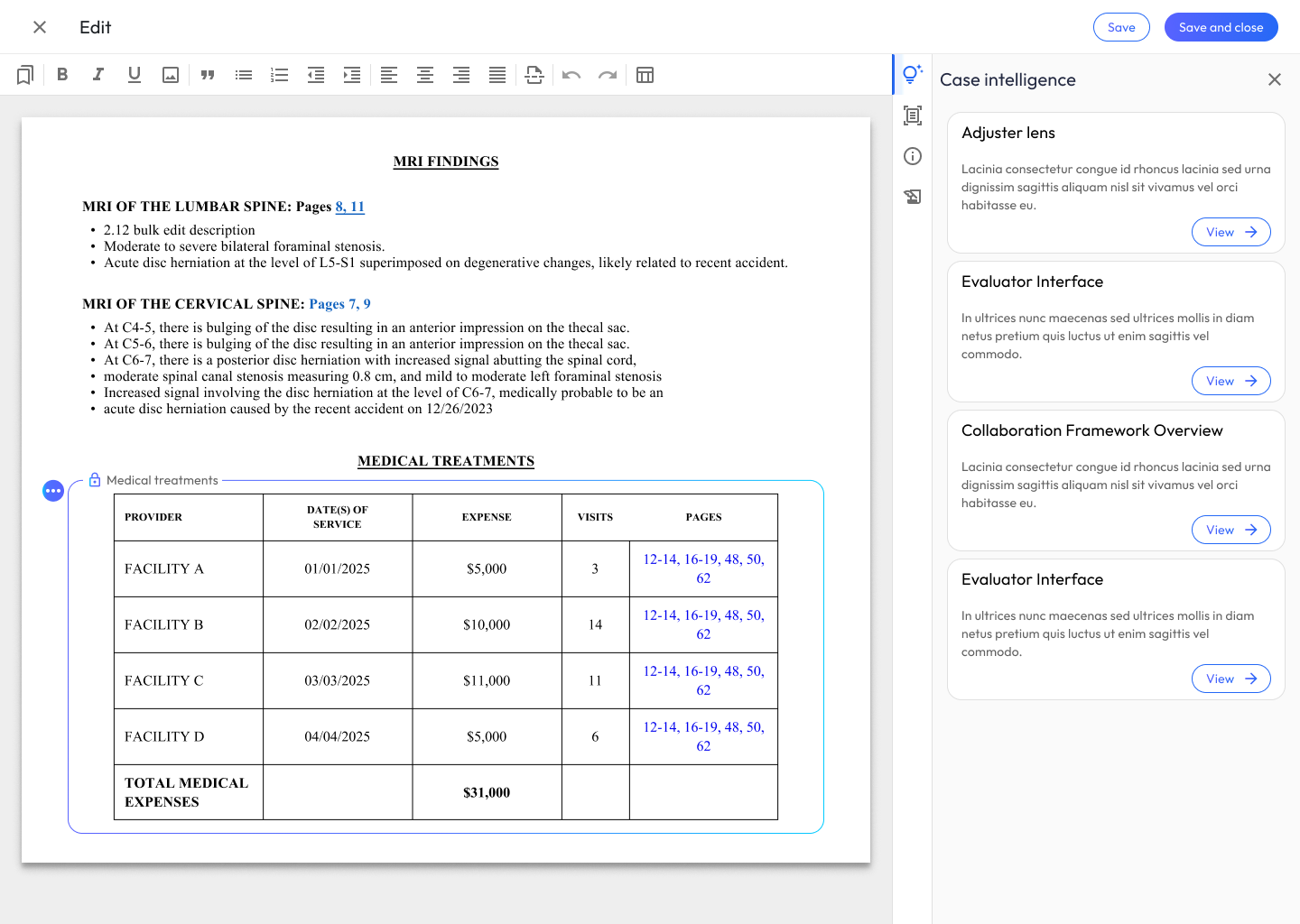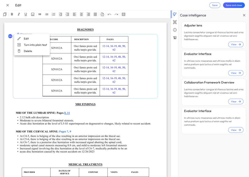 Scenario: The narrative is looking good. Now, you need to add a structured summary of the client’s medical treatments, specific diagnoses, and MRI findings.