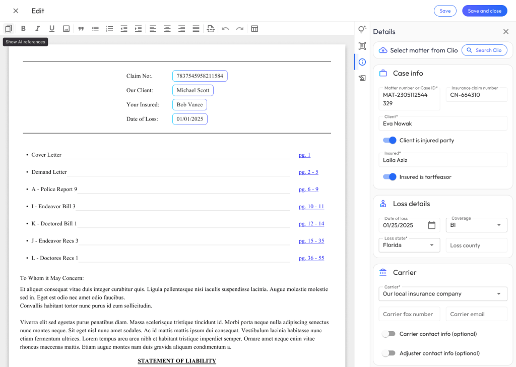 Create an industry leading, AI-enabled, document authoring experience that increases a law firm’s efficiency with creating bodily injury demand letters.