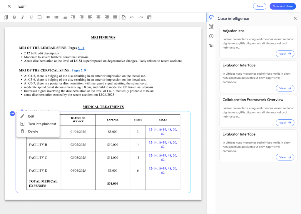 For instance, based on how users handled the injury narratives and medical tables, I refined the editing states, improved AI-status indicators, and streamlined the menus for manipulating generated content. By grounding these design updates in real user data, the final UI resolved the identified usability hurdles while building greater user trust in the AI’s output.